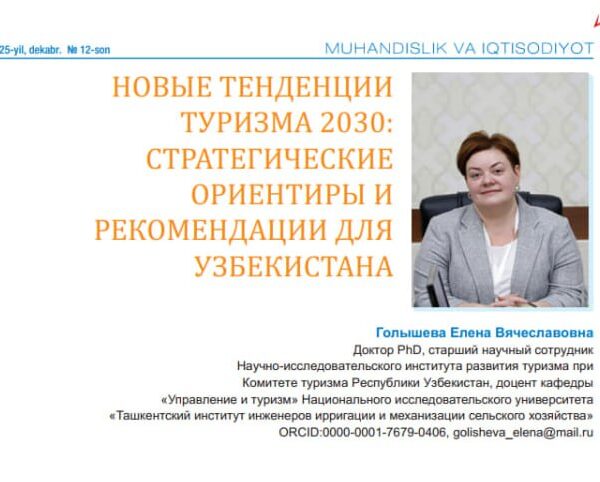🔹Turizm qo‘mitasi huzuridagi Turizmni rivojlantirish ilmiy-tadqiqot instituti xodimi — iqtisodiyot fanlari bo‘yicha PhD, katta ilmiy xodim, direktor Golisheva Ye.V. tomonidan «Новые тенденции туризма 2030: стратегические ориентиры и рекомендации ... Read More