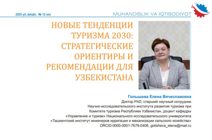 🔹Turizm qo‘mitasi huzuridagi Turizmni rivojlantirish ilmiy-tadqiqot instituti xodimi — iqtisodiyot fanlari bo‘yicha PhD, katta ilmiy xodim, direktor Golisheva Ye.V. tomonidan «Новые тенденции туризма 2030: стратегические ориентиры и рекомендации для Узбекистана» mavzusida ilmiy maqola tayyorlanib, «Muhandislik va iqtisodiyot» jurnalida chop etilgan.