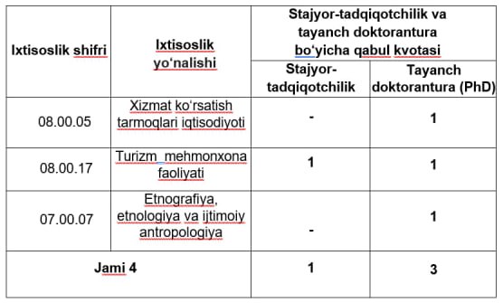 🔹O‘zbekiston Respublikasi Vazirlar Mahkamasining 2017-yil 22-maydagi “Oliy o‘quv yurtidan keyingi ta’lim tizimini yanada takomillashtirish chora -tadbirlari to‘g‘risid”gi qaroriga muvofiq, Turizm qo‘mitasi huzuridagi turizmni rivojlantirish ilmiy-tadqiqot instituti davlat byudjeti mablag‘lari xisobidan o‘qish bo‘yicha 2026-yil uchun ajratilgan qabul kvotasi asosida stajyor-tadqiqotchilik va tayanch doktoranturaga (PhD) quyidagi mutaxassisliklar bo‘yicha tanlov e’lon qiladi: