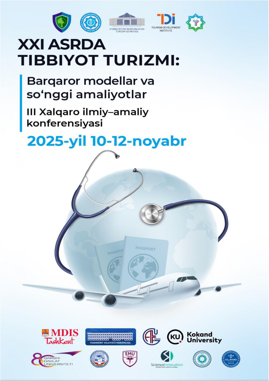 🔹Turizmni rivojlantirish ilmiy-tadqiqot instituti sizni 2025-yil 10-12-noyabr kunlari «XXI asrda tibbiyot turizmi: barqaror modellar va so‘nggi amaliyotlar” III Xalqaro ilmiy–amaliy konferensiyasida ishtirok etishga taklif etadi.