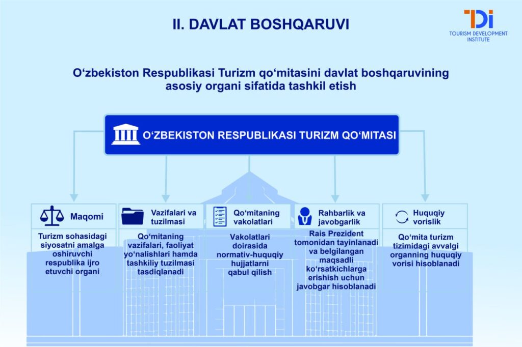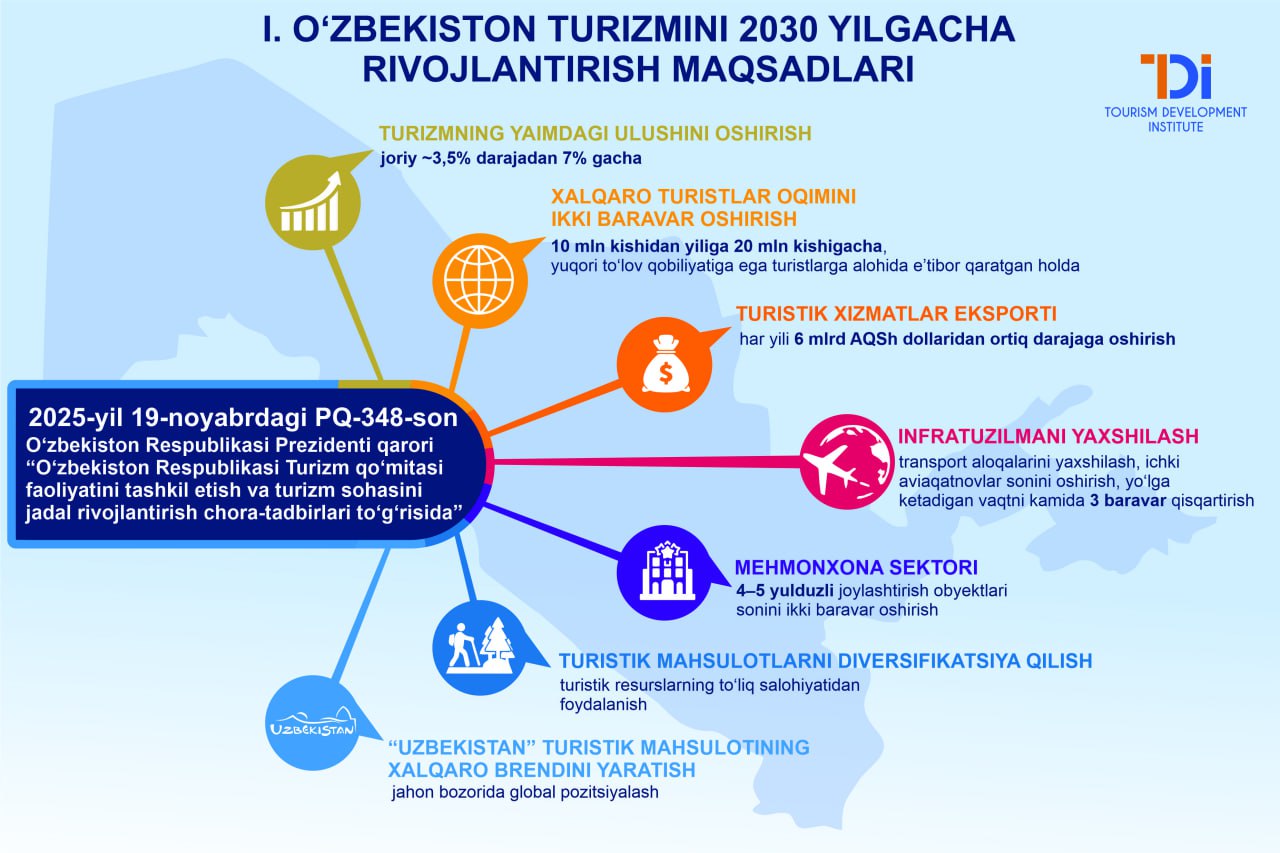 Turizmni rivojlantirish ilmiy-tadqiqot instituti tomonidan O‘zbekiston Respublikasi Prezidentining 19.11.2025-yildagi «O‘zbekiston Respublikasi Turizm qo‘mitasi faoliyatini tashkil etish va turizm sohasini jadal rivojlantirish chora-tadbirlari to‘g‘risida»gi PQ-348-son qarorining asosiy maqsad va vazifalarini tushuntiruvchi infografika tayyorlandi.