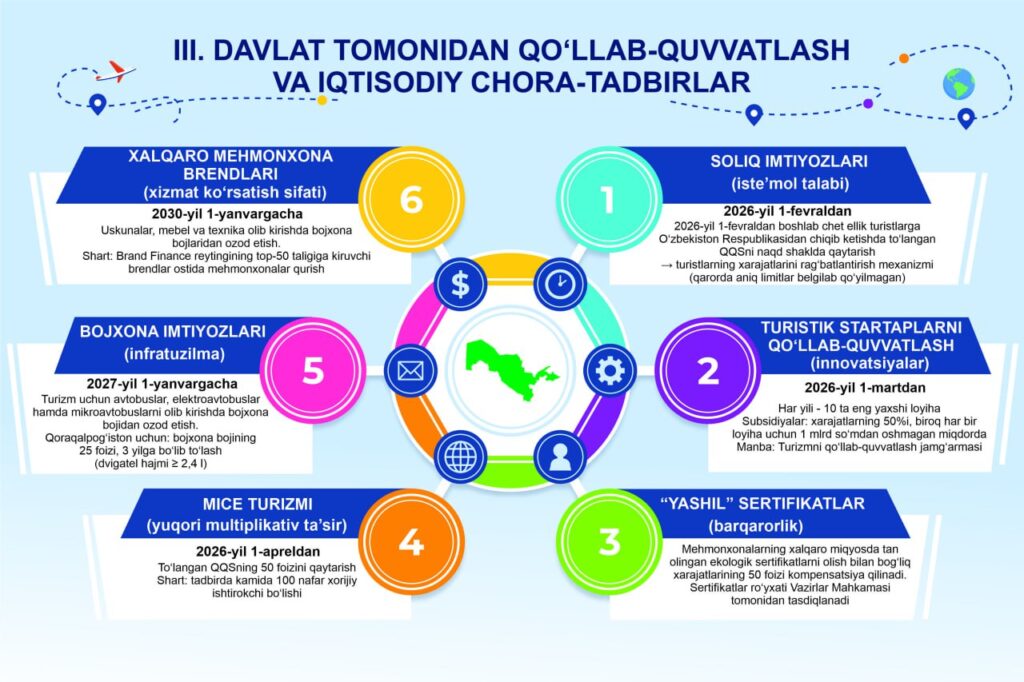 Hujjat 2030-yilgacha bo‘lgan maqsadlarni, jumladan, turizmning yalpi ichki mahsulotdagi ulushini 7 foizgacha oshirish, xorijiy sayyohlar sonini 20 millionga yetkazish, shuningdek, asosiy qo‘llab-quvvatlash choralarini nazarda tutadi: xorijiy sayyohlarga QQSni qaytarish, turistik startaplarni subsidiyalash, MICE-turizmni qo‘llab-quvvatlash, mehmonxonalarda «yashil» standartlar, shuningdek, turizm infratuzilmasi va xalqaro mehmonxona brendlari uchun bojxona imtiyozlari va boshqalar.